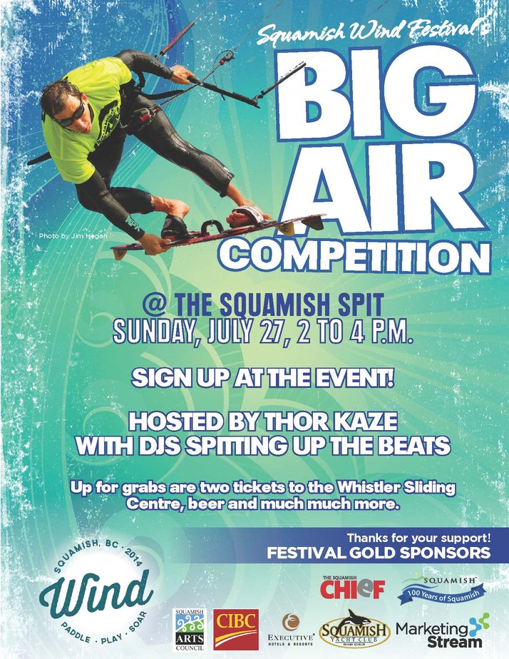 Anyone wanting to enter the Squamish Windfest Big Air Comp on July 27th should be at the spit to register by noon and we will be having a competitors meeting at 1:00, practice at 1:30 and the first heats will start at 2pm